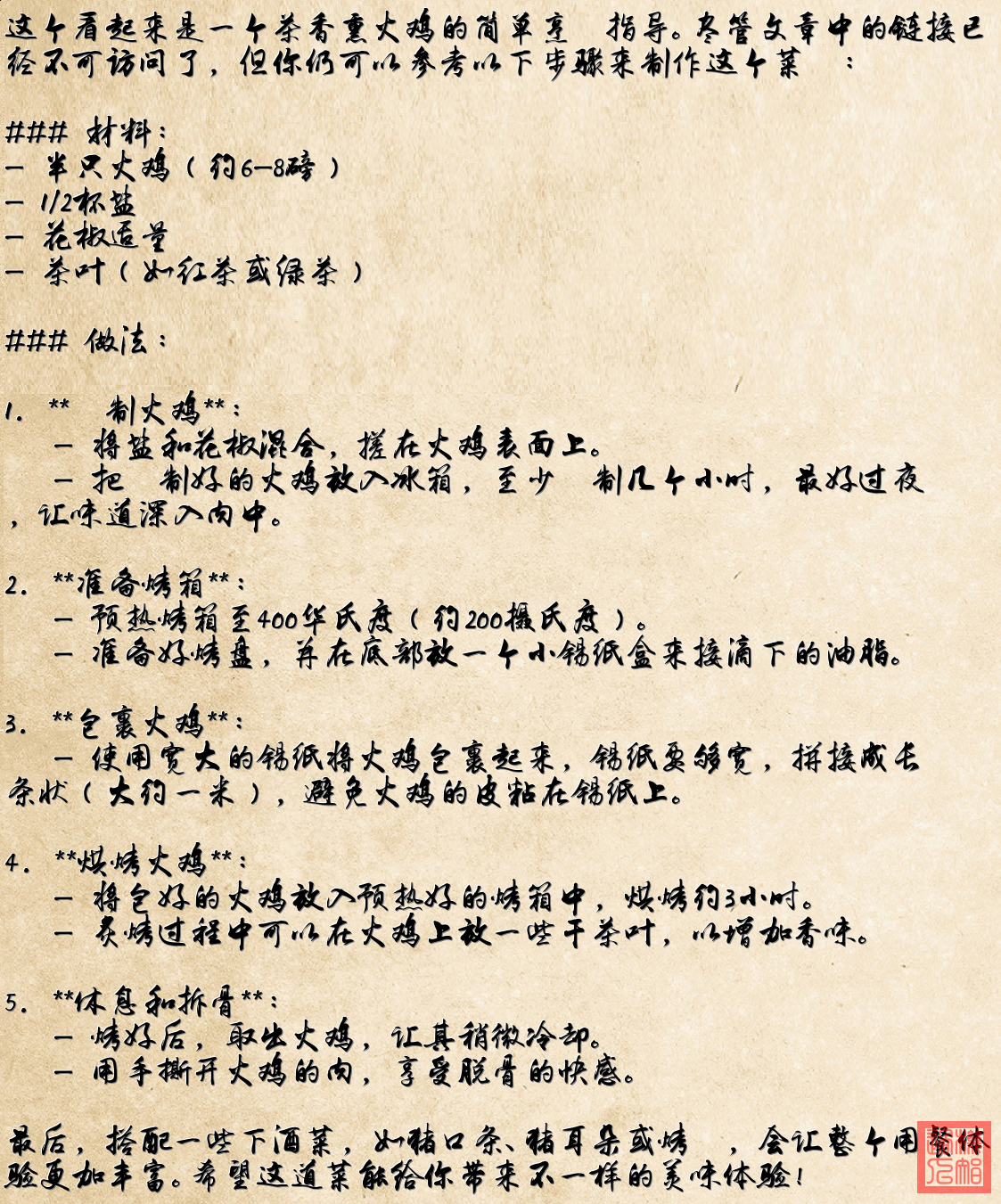 1. **圖片1**:成品茶香熏火雞,表皮金黃,看起來很誘人。