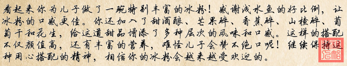 《夏日甜夢》 玻璃碗盛著透亮晶瑩 碎冰輕輕碰出風鈴聲 甜酒釀在碗底藏秘密 像媽媽哼唱的搖籃曲 芒果黃是盛夏的陽光 香蕉片彎成月牙形狀 山楂紅點點灑在雲端 葡萄幹像星星落進碗 花生碎是調皮的小雨滴 跳進這碗甜蜜的銀河裏 勺子攪動童年的記憶 每個夏天都值得被珍惜 廚房飄來熟悉的氣息 孩子眼裏有整個星係 簡單食材變神奇魔法 這就是家最美的童話