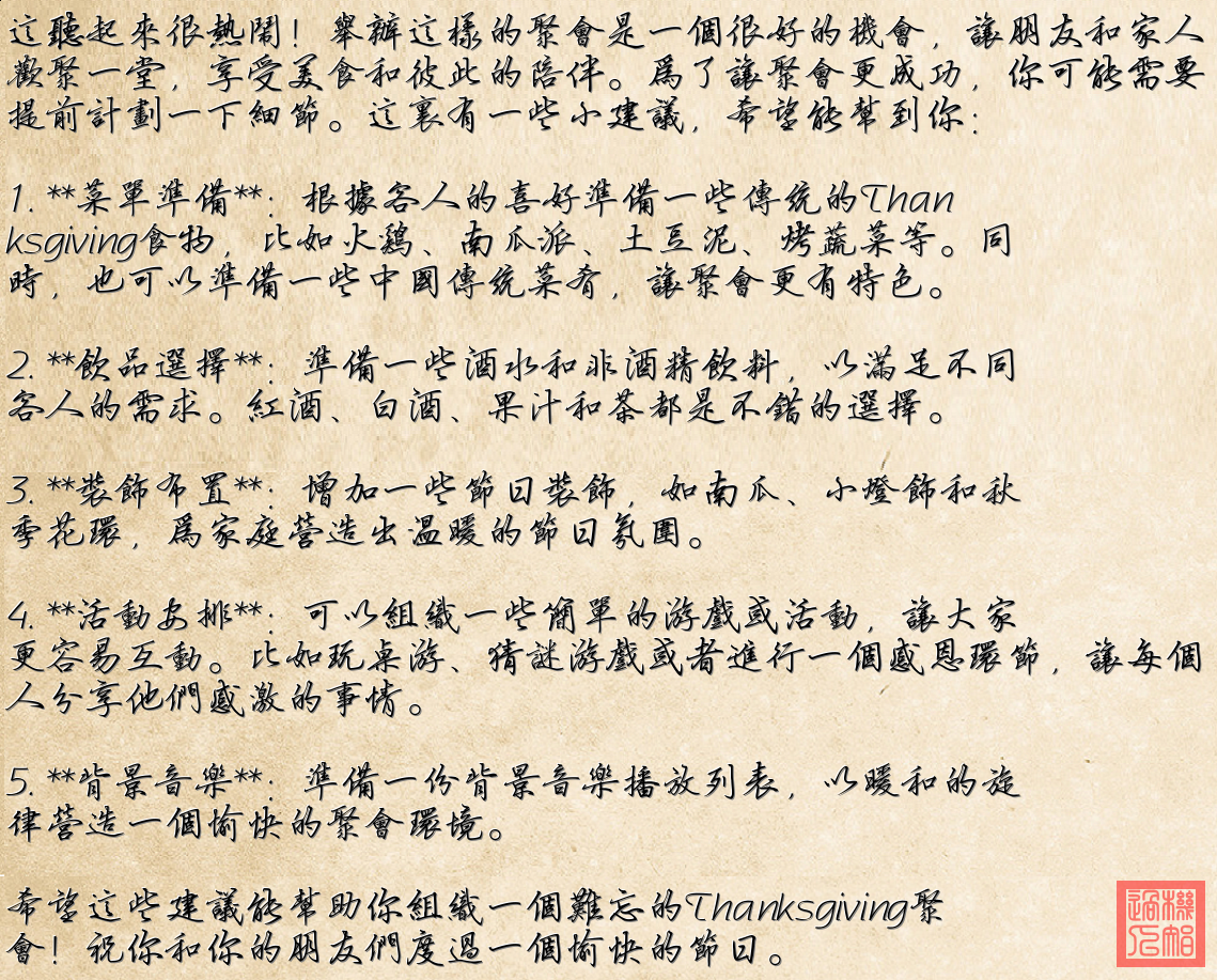 《感恩的盛宴》 爐火映紅每張臉龐 瓷盤盛滿秋日陽光 葵花籽在指尖輕響 開心果藏著童年願望 核桃的紋路刻著時光 花生殼裏故事悠長 遠方的風捎來問候 餐桌擺滿四季芬芳 烤肉的香氣漫過窗框 鮮蝦在銀盤閃爍微光 貝類張開大海的懷抱 涼拌菜拌進月色清涼 東西風味在此交響 瓷盤與木筷輕輕碰撞 每道菜肴都在訴說 相聚是世間最美佳釀 燭光搖曳成星河 笑聲碰響琉璃杯盞 我們把收獲裝進行囊 把感謝種在來年土壤 當南瓜派甜香飄散 當肉桂在杯中回旋 這滿屋溫暖的燈火 就是人間最美的詩篇