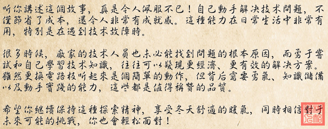 《暖冬自修記》 寒夜總在初冬降臨 暖氣片沉默如冰 維修單上的數字刺眼 保修期剛過兩年 拆開鐵殼查看線路 電路板布滿謎語 手機鏡頭記錄紋路 在深夜尋找答案 九十塊換來新希望 螺絲刀擰開困境 每根線都記得歸處 像候鳥不忘舊巢 這個冬天不再顫抖 鍋爐哼著安穩曲 手指殘留金屬溫度 是自修理的勳章 當雪花又貼上窗欞 溫暖在屋內流淌 省下的不止是金錢 還有那份不認輸的倔強