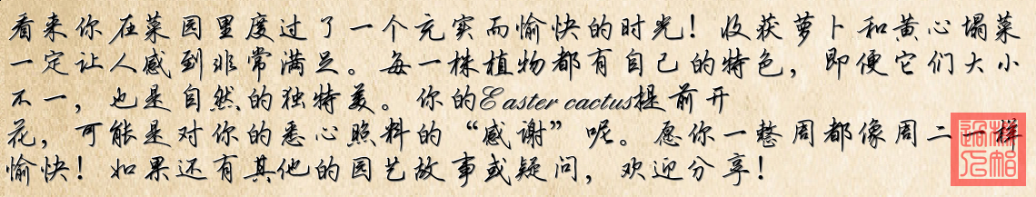 《秋日園中歌》 拔蘿卜的手沾著泥土香 大大小小排成行 像祖孫三代曬著太陽 黃心塌菜在竹籃裏躺 收拾完的菜畦真清爽 亂糟糟變整齊行 南牆根那盆蟹爪蘭啊 不合時宜地吐露芬芳 周二午後風微涼 鐵鍬靠在籬笆旁 誰家庭院秋色裏 藏著春天在綻放 蘿卜纓子青又長 塌菜葉脈泛金光 季節亂了又何妨 花開就是好時光 汗珠滴在泥土上 收獲裝滿小竹筐 不問春秋怎交替 隻管低頭種希望