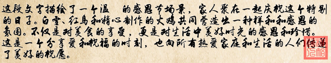 《感恩節素描》 雪花在窗外輕輕旋轉 紅鳥掠過黃昏的屋簷 廚房飄來肉桂的香甜 餐桌上擺滿豐收的盛宴 你用水果拚出火雞模樣 草莓作羽衣 藍莓當眼眶 女兒畫的紅鳥停在蛋糕上 巧克力翅膀載滿童年幻想 燭光裏刀叉碰響瓷盤 紅薯冒著金黃的溫暖 咖啡拉花有馴鹿奔跑 小熊在奶泡裏笑得柔軟 窗外鳥台積著薄薄雪霜 真假紅鳥互相凝望 就像時光在此刻重疊 將美好瞬間永遠珍藏 我們舉杯不說太多言語 眼神裏流淌著相同記憶 感謝這平凡的人間煙火 讓愛在餐桌上生生不息