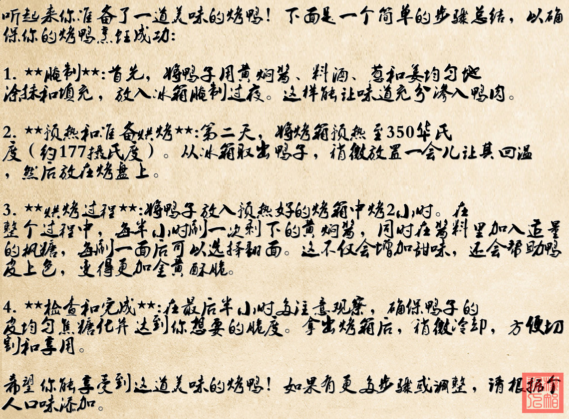 《金縷鴨香》 琉璃琥珀色 爐火吻過夜露凝霜 楓糖繞指柔 為酥衣披上蜜色光 每寸紋理都記得 薑蔥的呢喃 時光在旋轉 醬香滲入骨肉的詩行 薄餅如雲展 托起一輪暖陽 蔥絲落玉盤 疊成青翠山巒 甜麵醬裏藏 棗木熏染的過往 刀鋒遊走時 聽見晨霧中的吟唱 脆響驚醒了 沉睡的瓷盤 油珠在皮上跳著 唐朝的胡旋 是誰將月色 醃入醇厚酒壇 讓每絲纖維都浸透 星光的誓言 舌尖有運河 流過千年驛站 這滋味穿過 鏤花窗欞與雕欄 當青瓷遇見 琥珀色的波瀾 方知人間至味 是煙火寫的浪漫