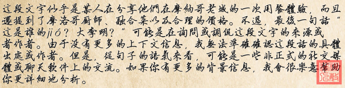 《摩納哥的腳印》 ——給在舊城迷路的味蕾 石板路盡頭藏著藍白相間的門 侍者端來北非的黃昏 薄荷茶香穿過地中海的風 在刀叉間長出阿特拉斯山的紋 甜點盤裏音符沿著五線譜流浪 巧克力澆鑄成樂章 二十二塊半買下整晚的月光 王宮鍾聲在肉桂粉裏慢慢變涼 金色腳印烙在二零一七年的秋 誰的名字在鵝卵石上生了鏽 摩洛哥不是摩納哥的鄉愁 就像撒哈拉從不是地中海的沙洲 (白): “薄荷茶續到第三杯的時候 忽然嚐出阿加迪爾港的日頭 那位廚師轉動塔吉鍋的節奏 讓巴黎的雨學會了沙漠的轉音” 意大利氣泡在杯底唱著船歌 馱著橄欖駛向丹吉爾港的月色 當粗麥粉遇見勃艮第的紅酒 原來鄉愁是道需要迷路才能找到的入口 金色腳印在路燈下泛起舊銅光 像留在菜單背麵的即興演奏 摩納哥的夜啊請走慢些 讓我把這道融合的月光 就著星光再嚐一口