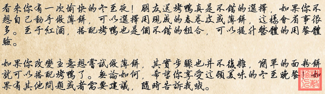 在冬至這樣特別的節日能吃上烤鴨,的確是很好的選擇。你可以把烤鴨和薄餅、甜麵醬、黃瓜條、蔥絲一起卷著吃,很有傳統北京烤鴨的風味。
