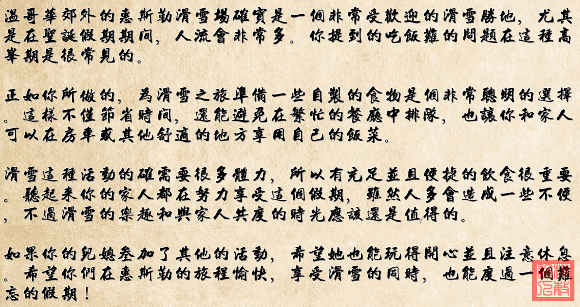 - 說明聖誕期滑雪遊客眾多,吃飯需要排隊。