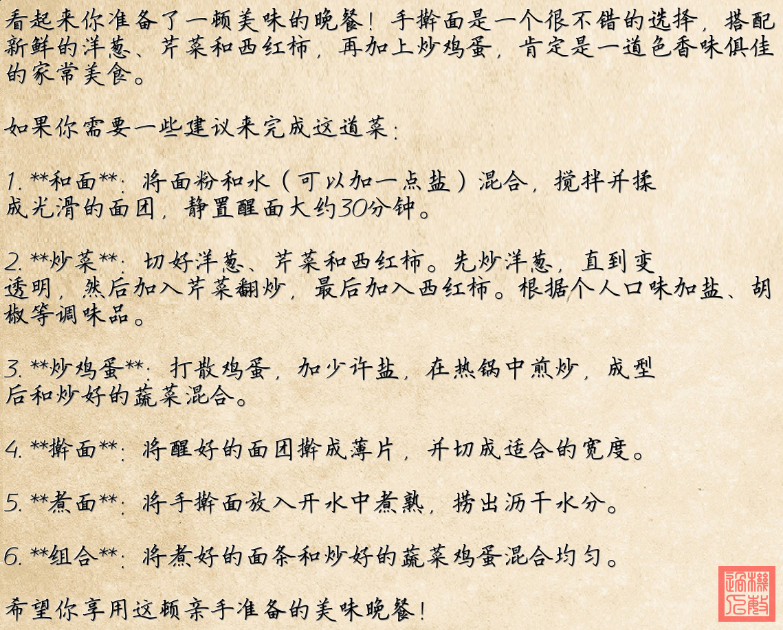 1. **成品展示**: 第一張圖片展示了一盤拌好的手擀麵,上麵有番茄炒蛋等配菜。麵條寬厚,配料色彩鮮豔,看起來非常可口。