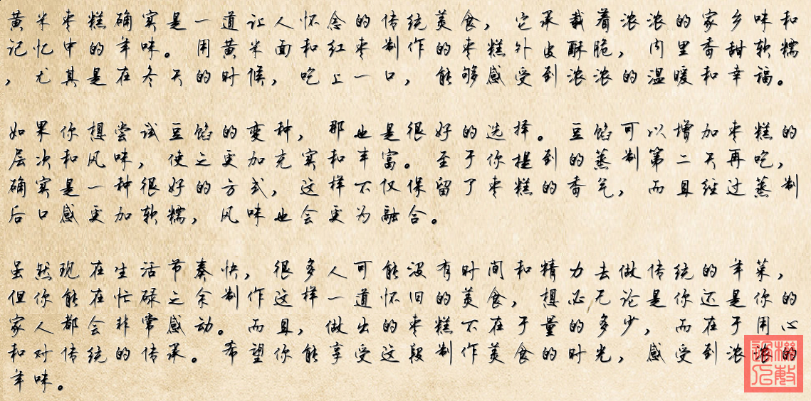 - 文章內容回憶了作者對於小時候家中製作黃米棗糕的記憶,描述了懷舊的鄉村味道以及製作方式。