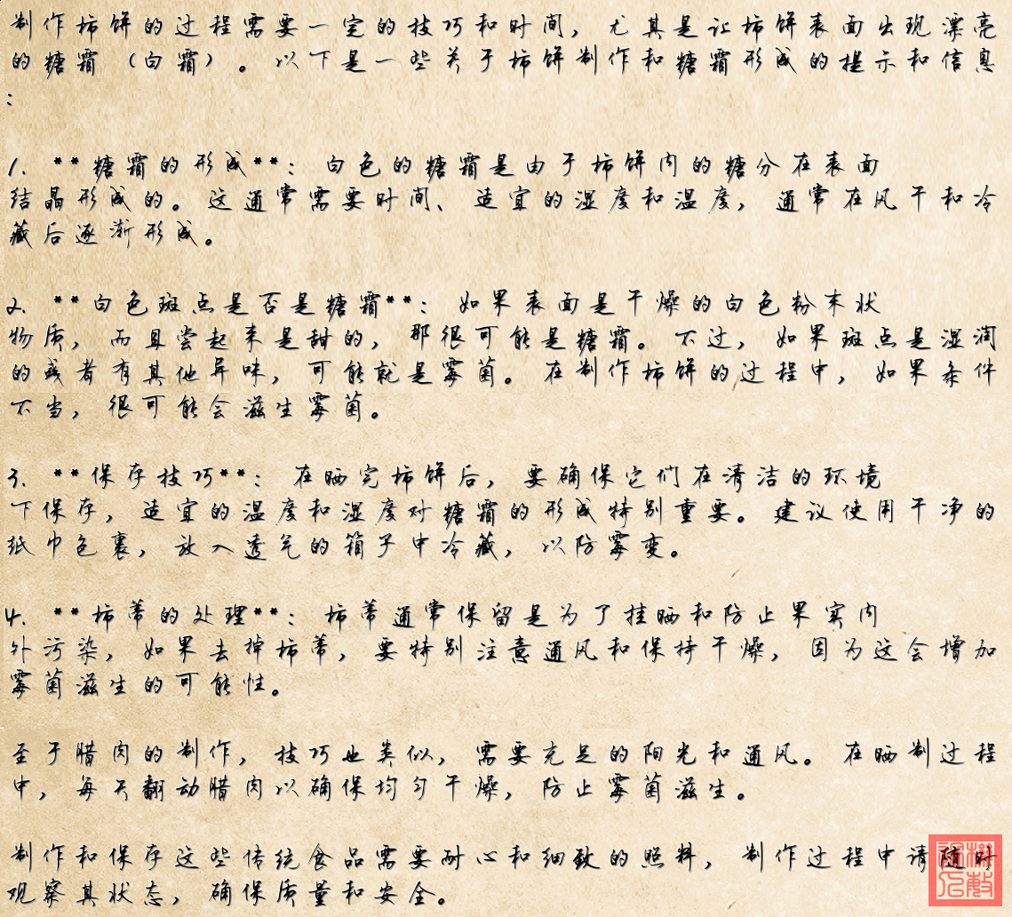 整個過程強調了傳統食物製作中的一些細節,比如保留柿蒂以避免長黴菌,以及曬幹、冷凍保存以誘發糖霜的出現。文章還提到了學習和分享晾曬經驗的過程。