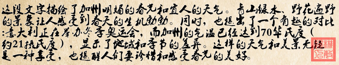 從文字描述中可以了解到,現在意大利正在舉行冬奧會,而加州的氣溫已經達到了 70 華氏度(約 21 攝氏度),顯示出兩地氣候的明顯對比。