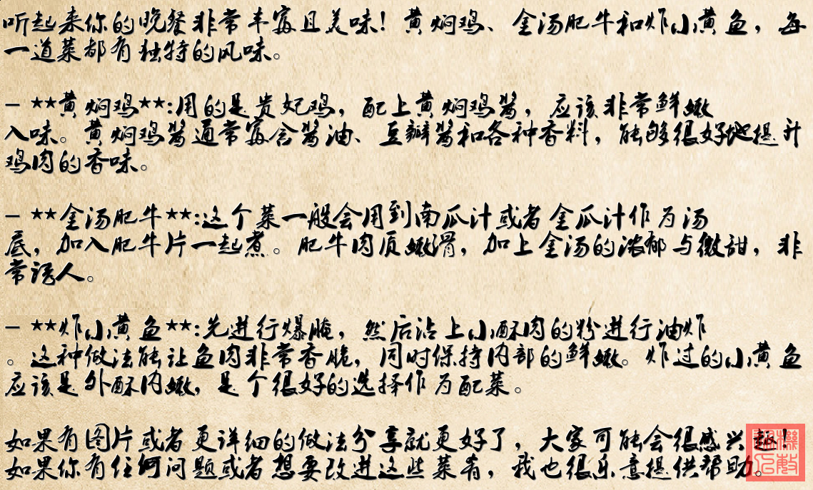 《廚房裏的魔法時刻》 櫥窗裏醬料瓶排成行 每罐都藏著煙火詩章 黃燜雞在砂鍋咕嘟唱 青椒與木耳跳圓舞曲 金色醬汁是月光流淌 肥牛卷舒展成波浪 金針菇在酸湯裏搖晃 舌尖遇見檸檬味太陽 原來幸福有固定配方 小黃魚遊進酥脆夢鄉 爆醃的鹹鮮長出翅膀 麵粉裹住海風的吟唱 油鍋裏綻開金黃鈴鐺 調味瓶旋轉出星光 餐桌上地圖正發燙 從川渝丘陵到渤海灣 原來故鄉是碗沿的熱量 電子爐跳動著藍光 抽油煙機哼著歌謠 當瓷碗碰響木桌的傍晚 全世界的風都路過廚房