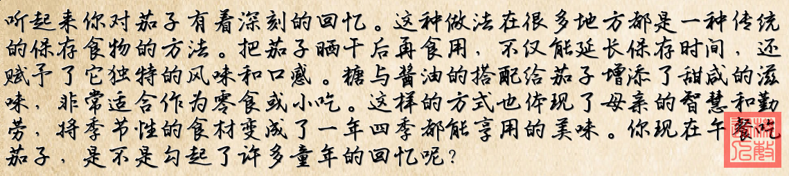 你提到小時候茄子下市時,你的母親會買很多茄子,煮熟後放糖和醬油炒,加以曬幹,當作零食來吃。這種做法不僅可以保存茄子的風味,還能製作成獨特的家常小吃。