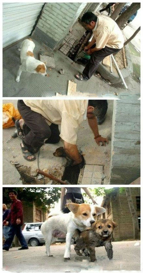 一隻流浪小狗掉入下水道,狗媽媽向路人求救,一位大叔找來了衝擊鑽和榔頭,砸開下水道將小狗救了出來,小狗得救,狗媽媽對他寸步不離。感動!救狗狗的大叔太棒了!