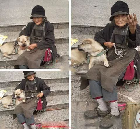 一位80多歲的婆婆,帶一隻狗狗,安靜的坐在路邊,幫小狗梳毛,乞討瓷杯裏有幾元錢,見有人路過,就露出一個慈祥的微笑。婆婆耳聰目明,最小的孩子也40多了。她被孩子攆了出來,就睡在醫院的角落。隻有婆婆從小養大的小狗一直不離不棄的跟著她。有時候重感情的未必是人。