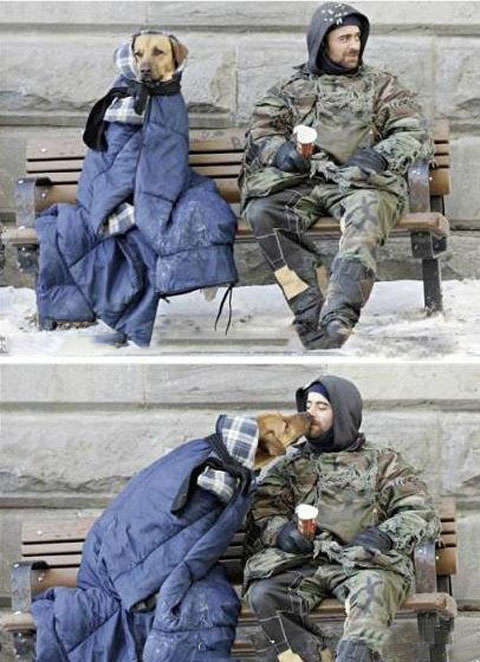 加拿大流浪漢,攝氏零下15度,用滿是補丁的衣服把自己包得緊緊的,然後把他唯一的財產、或許也是最重要的財產睡袋給了他的狗狗------- 你若不離,我定不棄。