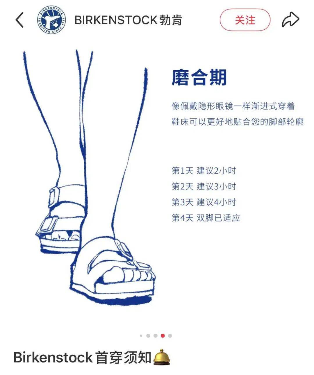 在官方《Birkenstock新手指南》首穿須知中,人們不僅接受著“第一次穿著前將鞋床扭一扭”的知識,也接受著延遲滿足。(圖/小紅書截圖)