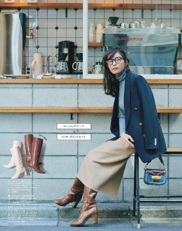 琥珀流光色的粗跟靴,最適合配卡其色直筒裙,啞光和亮麵的碰撞,深淺分明,是造型的層次感更加強烈。