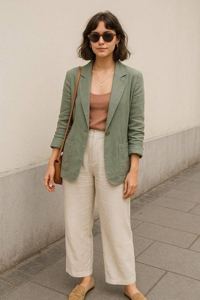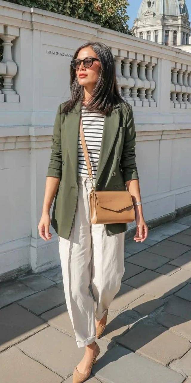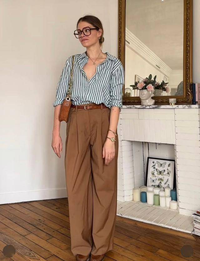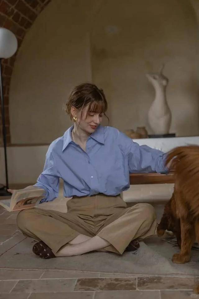 別把襯衫穿的太死板,領口解開兩顆,袖子挽到手肘,將頭發盤起來,戴對金屬耳環,吸引力拉滿,小棕鞋都變成了陪襯~