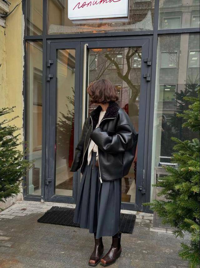 廓形設計的啞光感皮衣,配條百褶裙很有少女氣息,再用焦糖棕色的切爾西靴維持酷颯感即可。