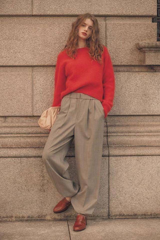 紅毛衣配卡其色西裝褲,踩雙紅棕色樂福鞋,風格和色彩相互扶持。