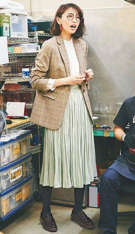淡綠色百褶裙出現的那一刻,讓棕色樂福鞋有了救贖,一腳蹬的設計,穿脫方便,亮麵牛皮更是充滿著複古質感,越穿越有味道。