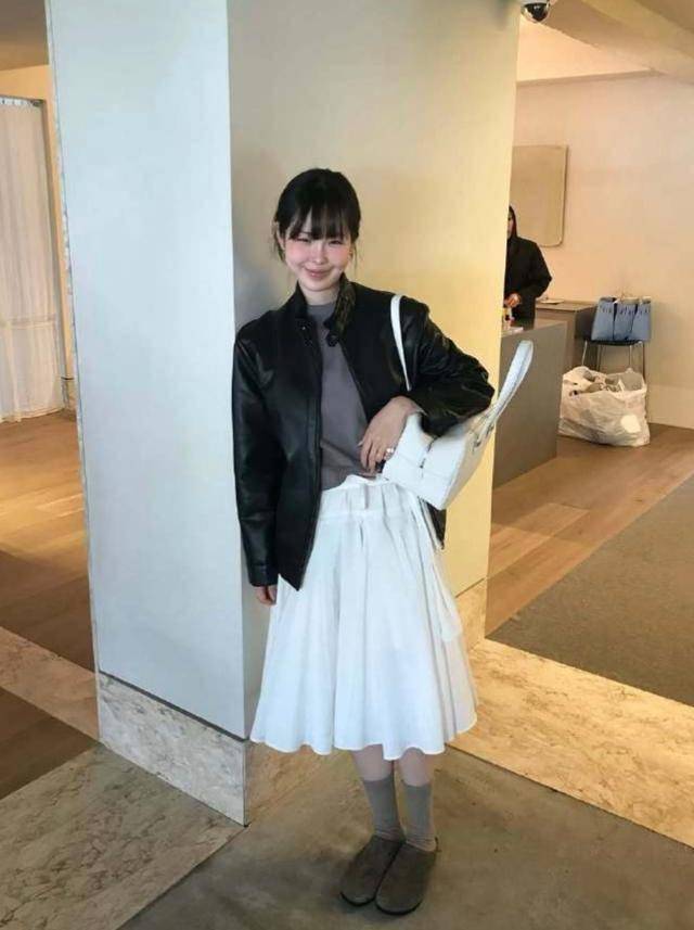 常見的白T恤,疊搭麂皮夾克,配條風琴裙,鞋子選同色係,協調感更好。