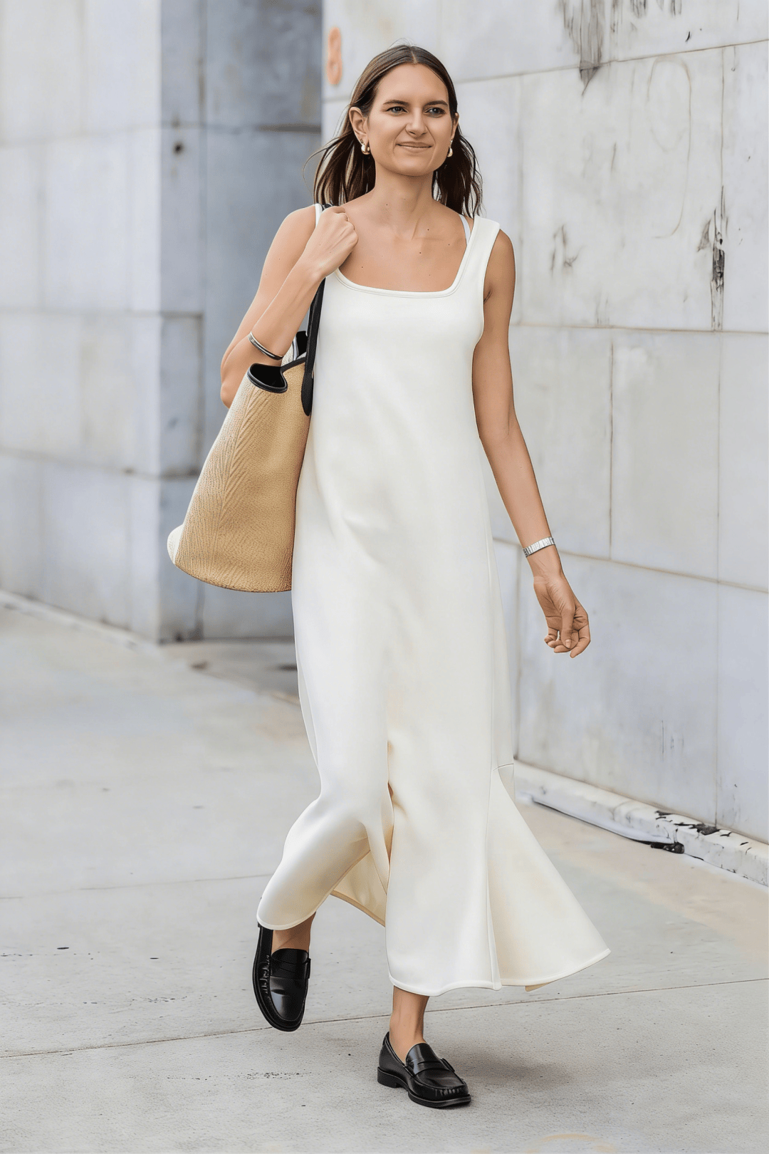 樂福鞋搭中長裙也完全 ok,優雅有質感。裙擺搖曳間露出一截腳踝,樂福鞋的利落剛好平衡長裙的柔美,整體穿搭會顯得非常知性。