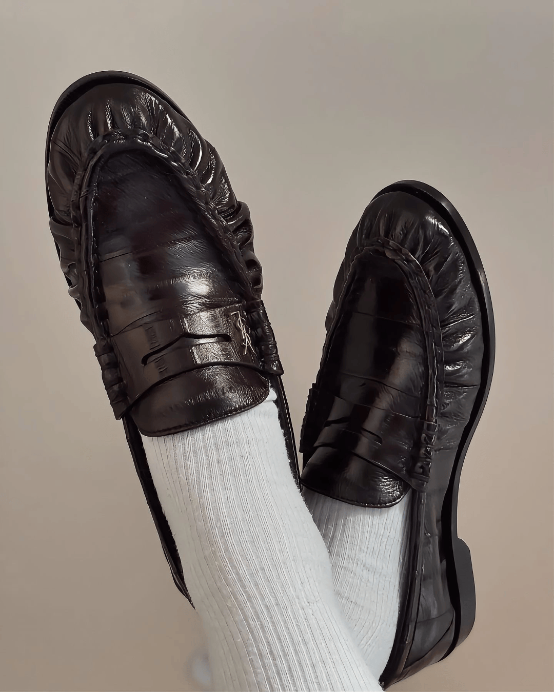 和 The Row 相比,它的鞋型更修長,上腳會顯得腳型更纖細。而且 Saint Laurent 的樂福鞋整體廓形更挺闊,穿起來沒有那麽軟塌,所以跟不同風格適配度更強。