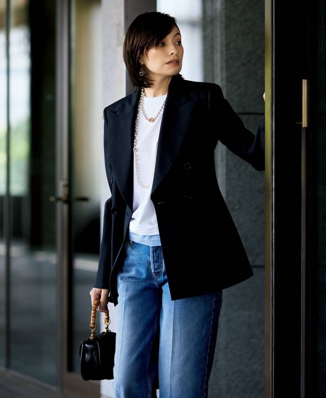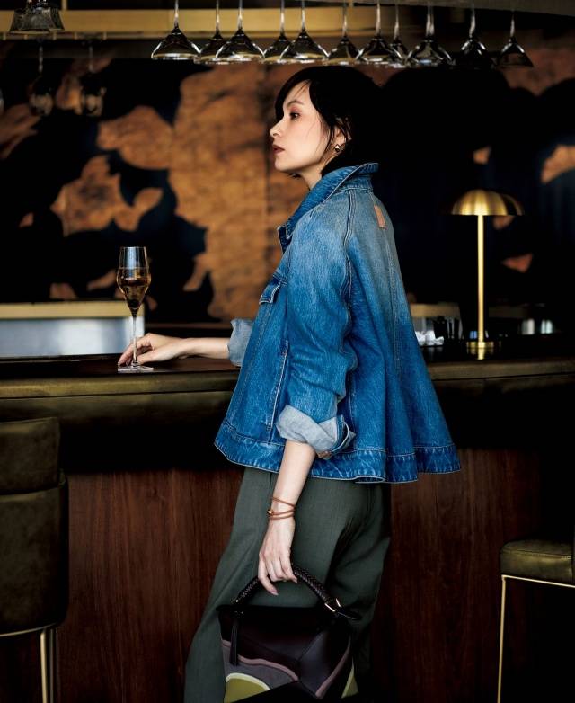 即使是以牛仔夾克和褲子這樣的休閑風格,也能感受到女性氣質。