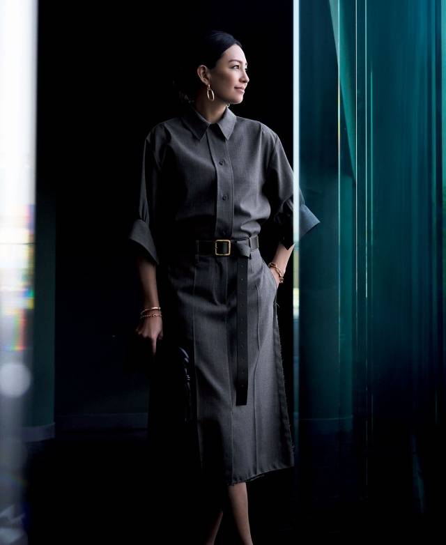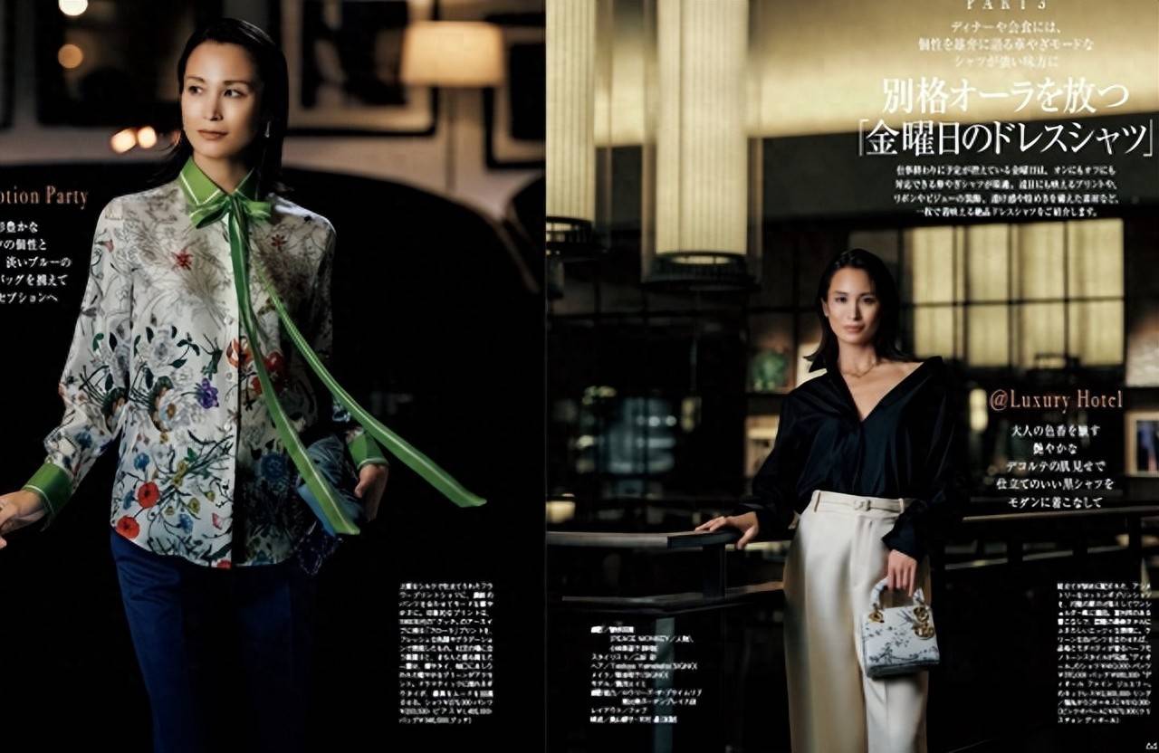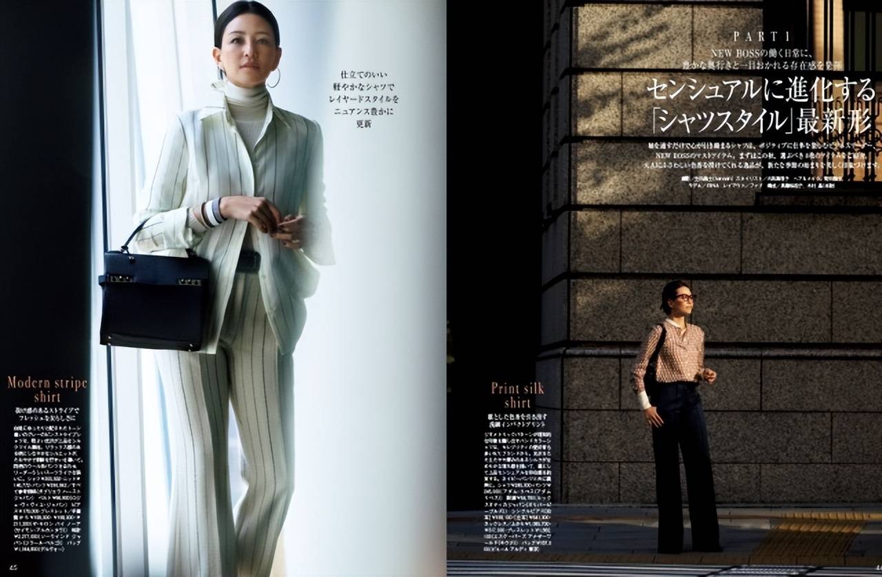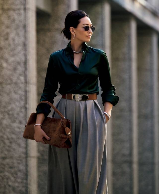 另一冠軍來自本期備受關注的“襯衫風格”。深綠色紐扣襯衫采用彈性真絲斜紋綢,光澤與流暢輪廓彰顯都市女性魅力。搭配寬鬆闊腿褲,突出上半身利落感,棕色腰帶與手袋增添秋日氣息,腰帶扣飾、珠寶與太陽鏡增添硬朗氣質,這套帥氣又優雅的搭配俘獲了眾多讀者的心。