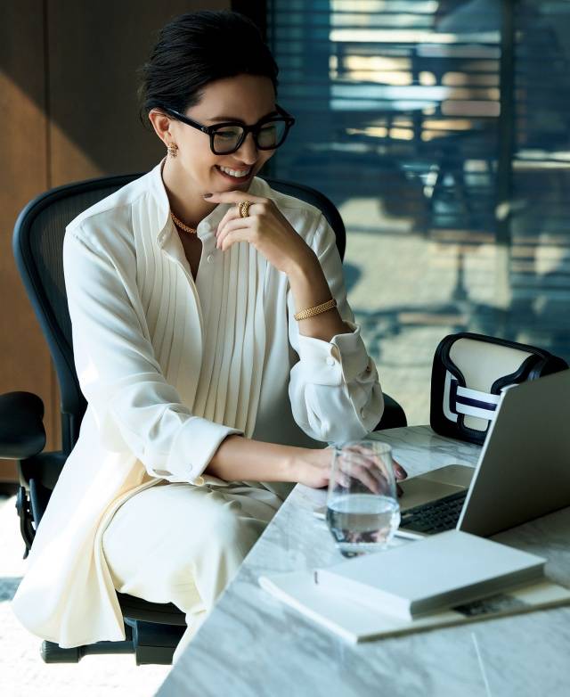 襯衫的穿著方式,如胸前的開衩程度等,顯得既優雅又充滿女人味,十分迷人。