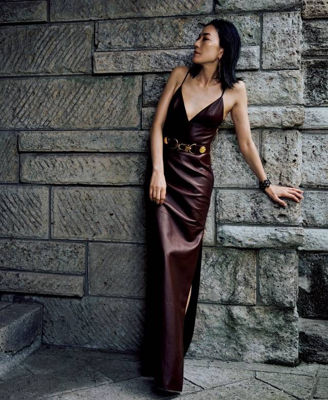 成熟桑葚般的紅紫色,為簡約的皮革連衣裙增添大膽而現代的印象。羊羔皮的光澤質感更凸顯出成熟的色彩韻味。簡潔的吊帶設計勾勒出利落身形,金屬裝飾的寬版腰帶與大號金屬手鐲的立體感更是點睛之筆,為整體造型增添層次。