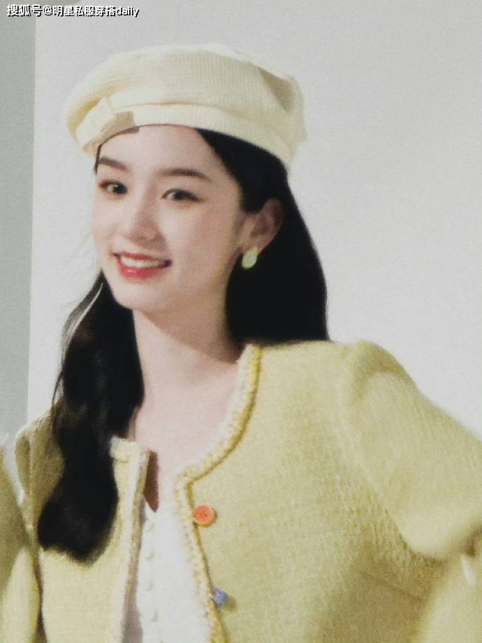 而換上黃色粗花呢小外套,搭配米白色針織衫,佩戴黃色貝雷帽,則元氣滿滿!