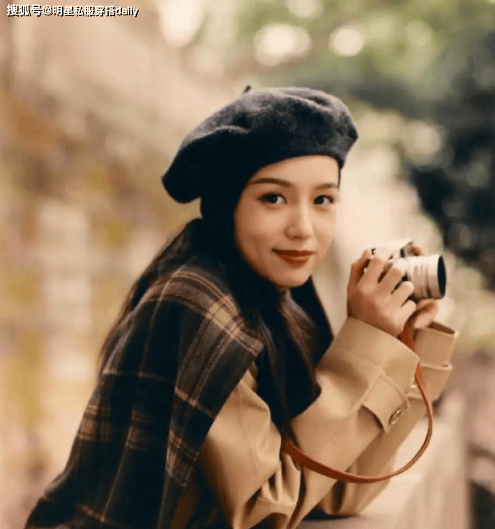 周也也曾經示範過灰色貝雷帽,選灰色貝雷帽,搭配卡其色風衣和格紋圍巾,深秋這樣穿,好美!
