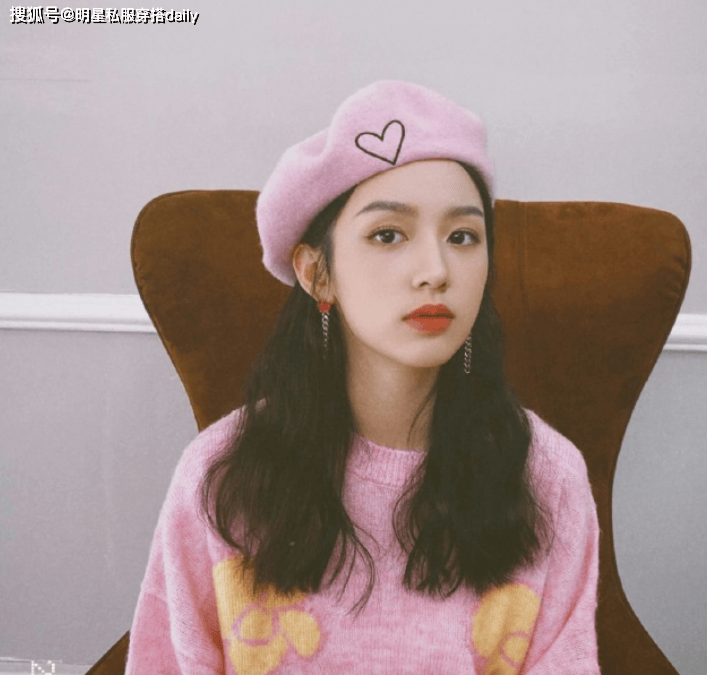 當然,不喜歡黑色也可以嚐試一下糖果色,雖然看起來很冷豔,但是周也私底下也是個甜妹!比如她喜歡粉紅色,身穿粉紅色套頭針織衫,搭配粉色貝雷帽,甜美的青春女大。