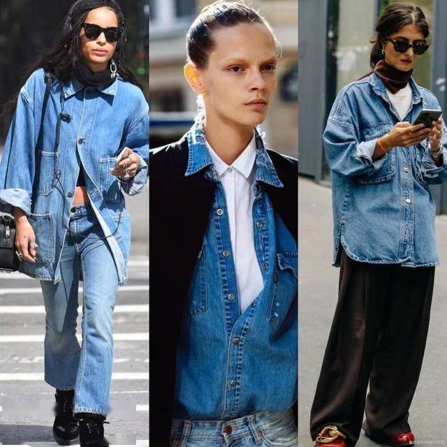 今年特別流行寬鬆牛仔外套搭配闊腿褲,整體的寬鬆版型營造出時髦帥氣的風格,減齡又顯高級。