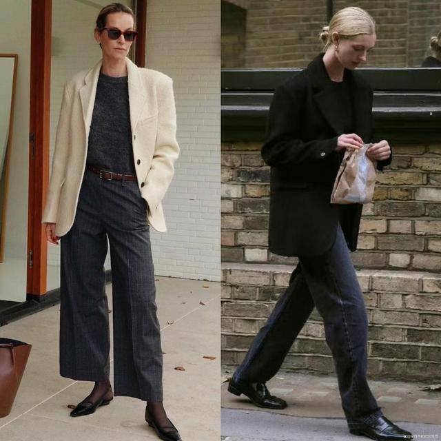 米白色的羊毛西裝,自帶高級質感,隻需要搭配簡單的灰色西褲,就可以輕鬆穿出老錢風的味道。