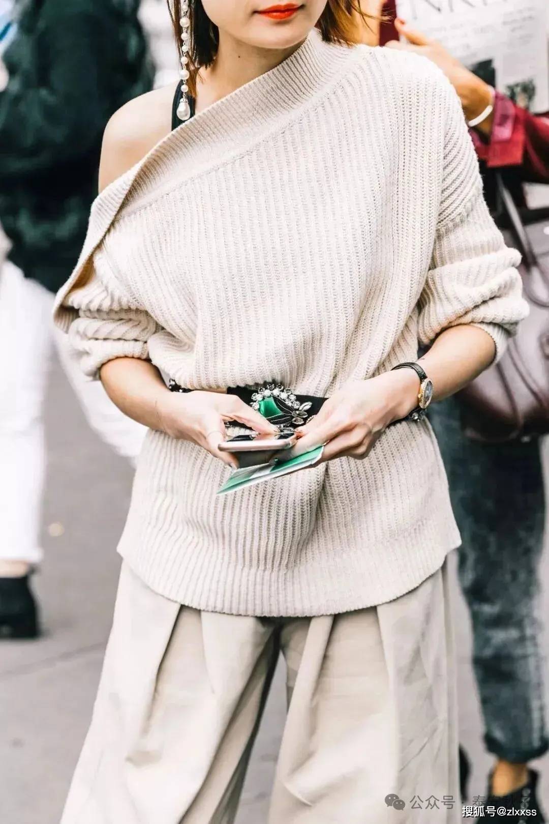 比如這件淺米色的羊毛衫,不對稱斜領的設計有些小性感。搭配同色係的闊腿褲,輕鬆穿出老錢風的味道。