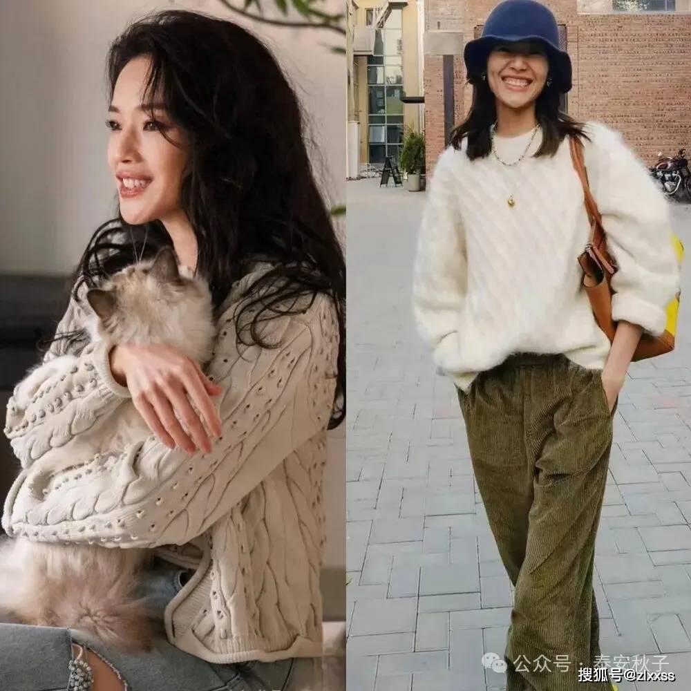 香草白色的羊毛衫選擇了扭花的設計,複古氣息更濃鬱一些。大一號的寬鬆版型帶來了慵懶鬆弛的氛圍感,穿起來也更顯瘦。