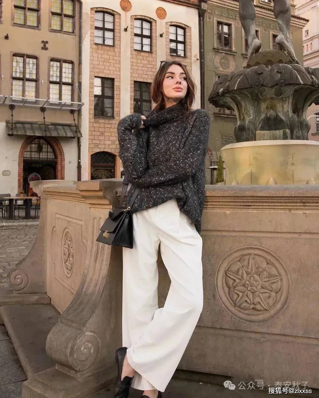 如果你是小個子女生,就用深灰色的高領羊毛衫搭配白色高腰闊腿褲。
