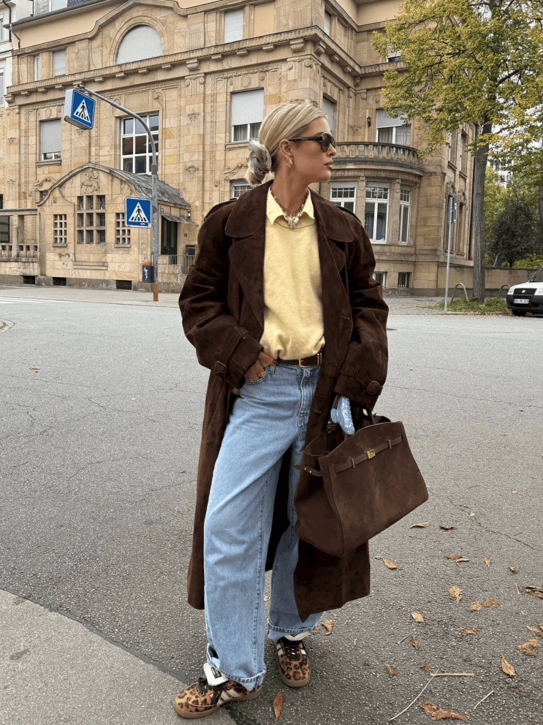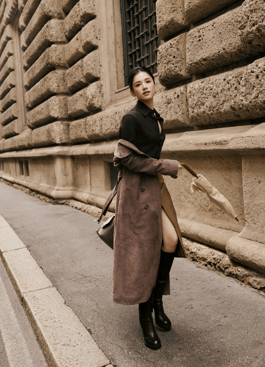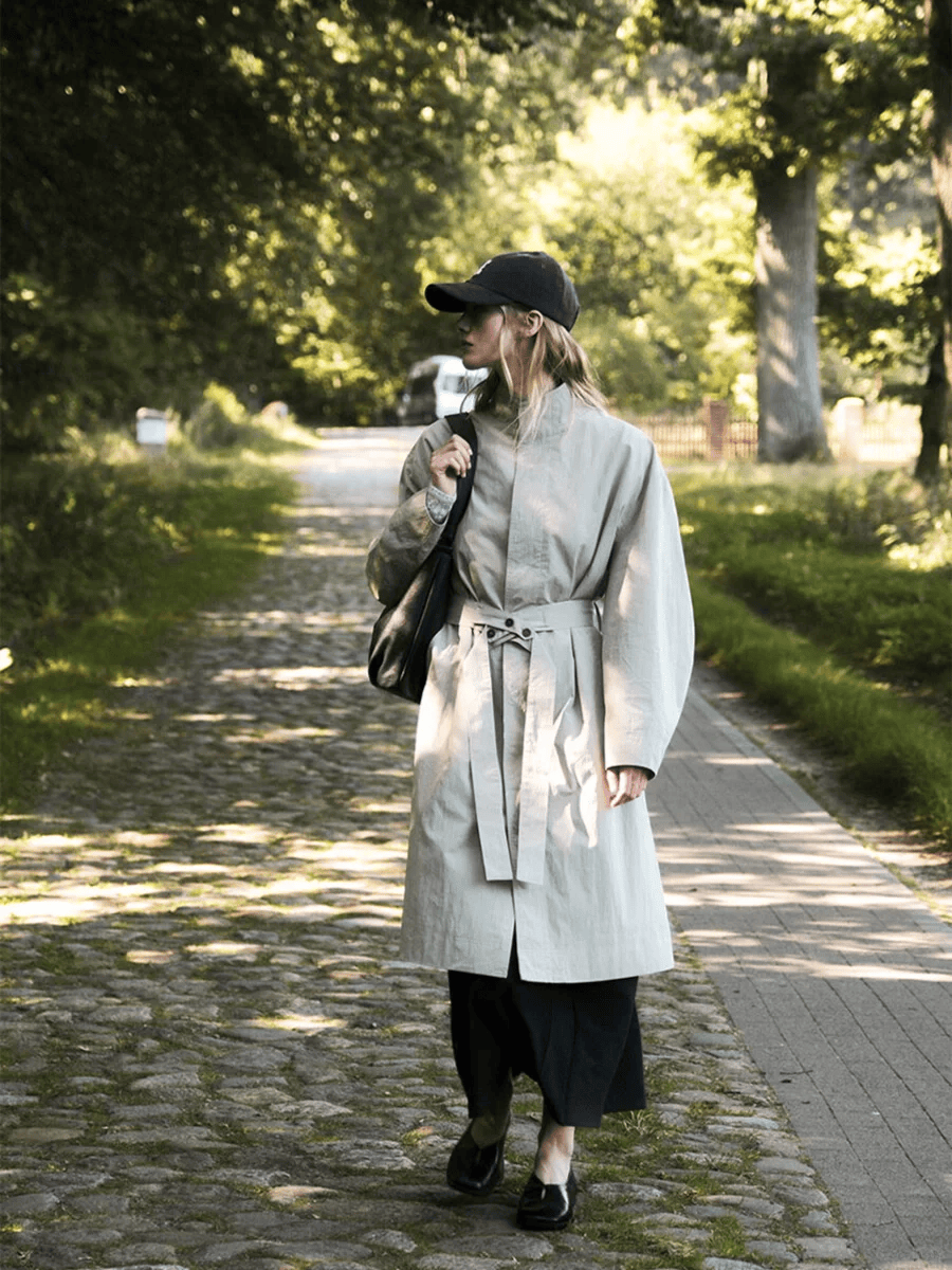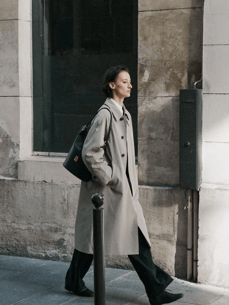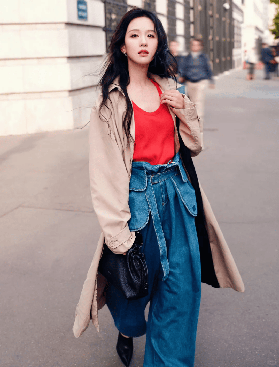 一件有質感的中長款風衣,就能搭遍所有秋裝,比如風衣+闊腿褲。