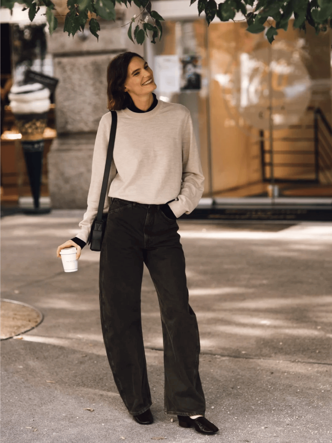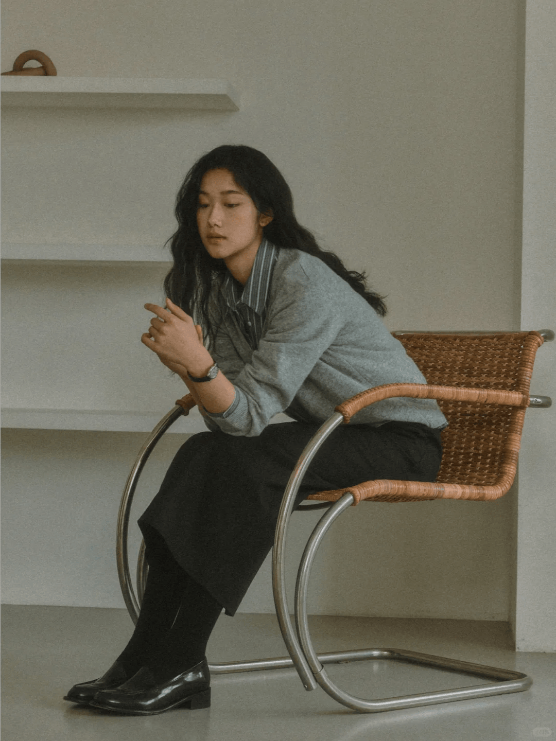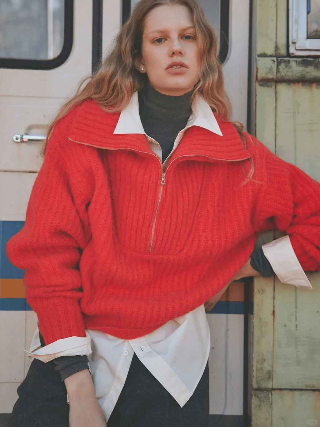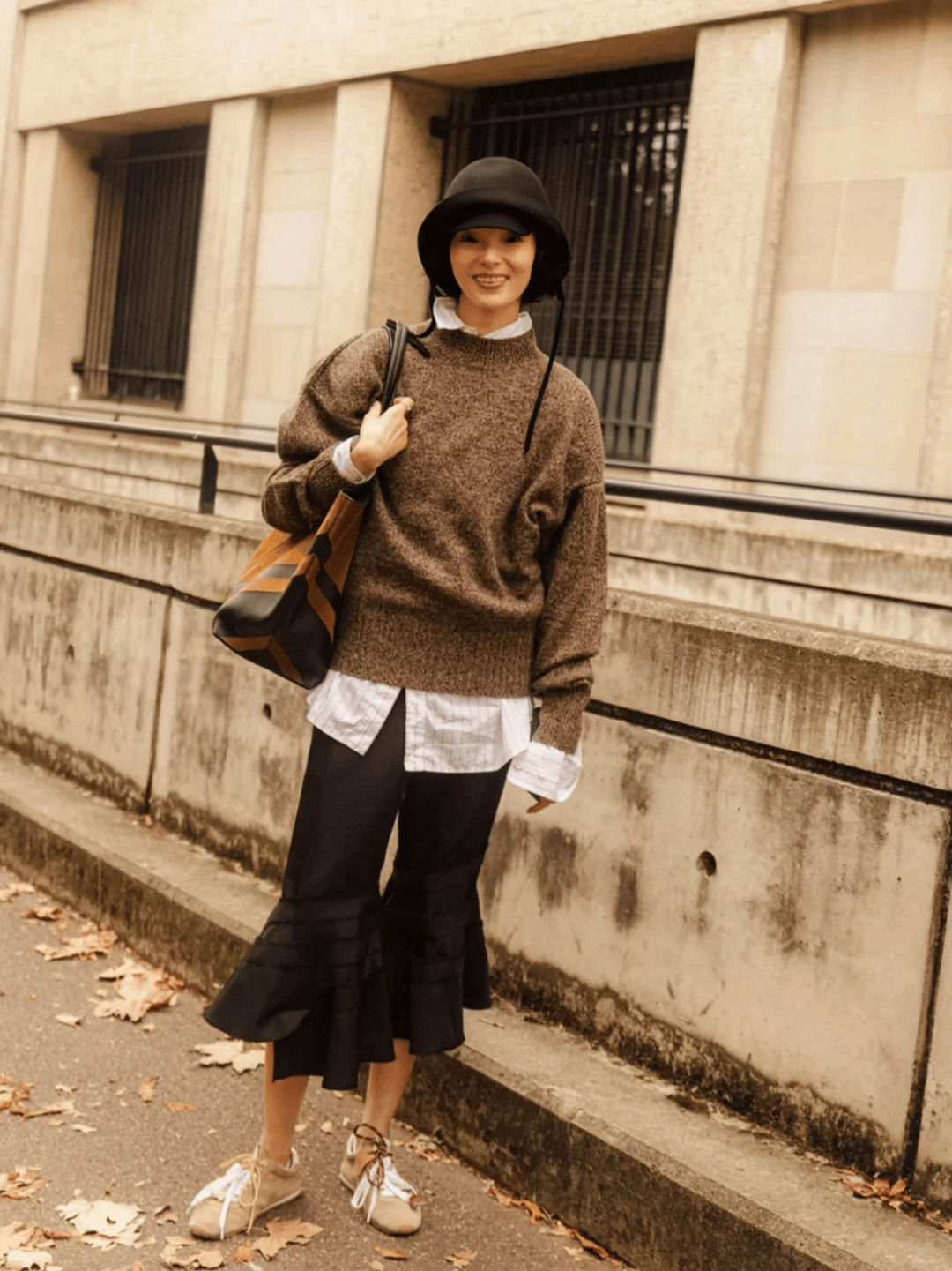 毛衣單穿無趣?試試內搭襯衫,解開前2顆扣子,中和了毛衣的沉悶感。