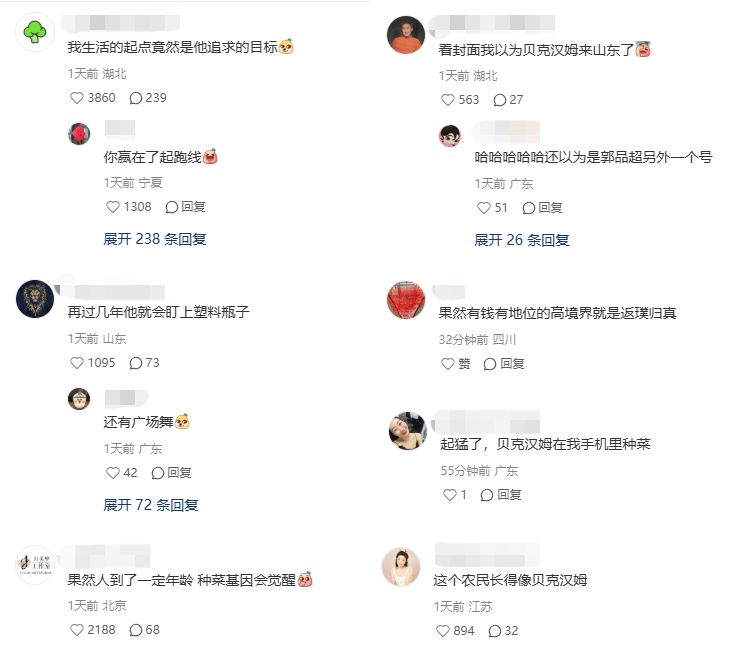 比如:“起猛了,貝克漢姆也到了退休種菜的年齡”;“還以為貝克漢姆來山東了”;“富人的盡頭是種菜”;“人到中年血脈覺醒,種種菜養養鳥”……小貝小紅書的評論區可以說是熱鬧非凡~