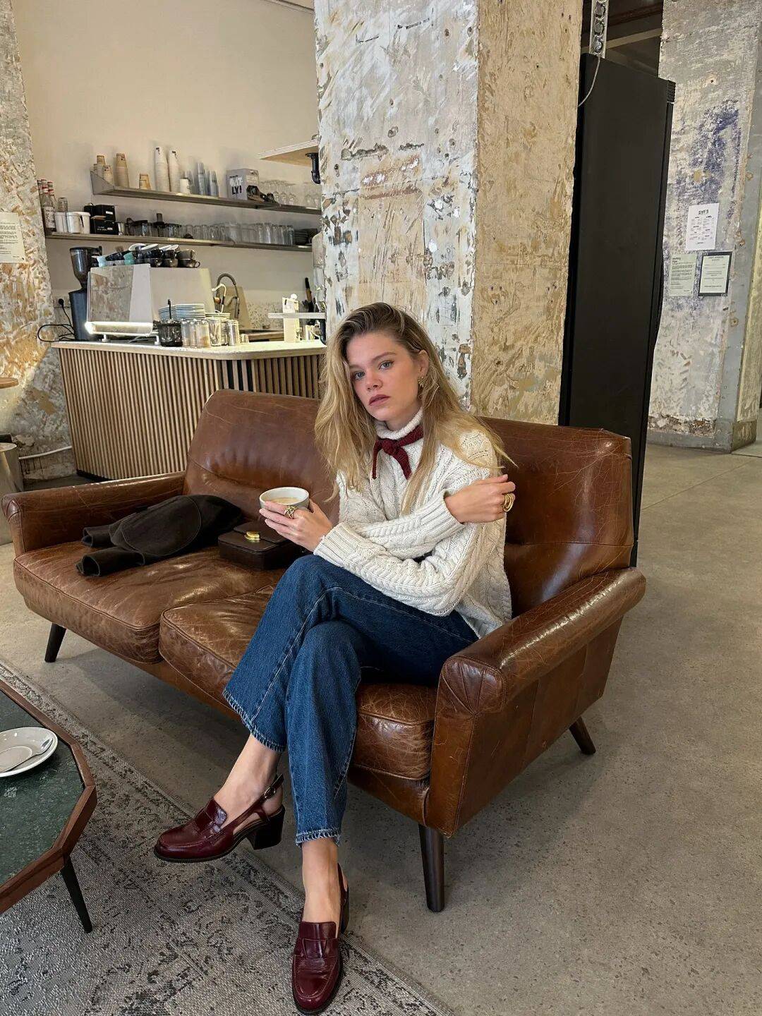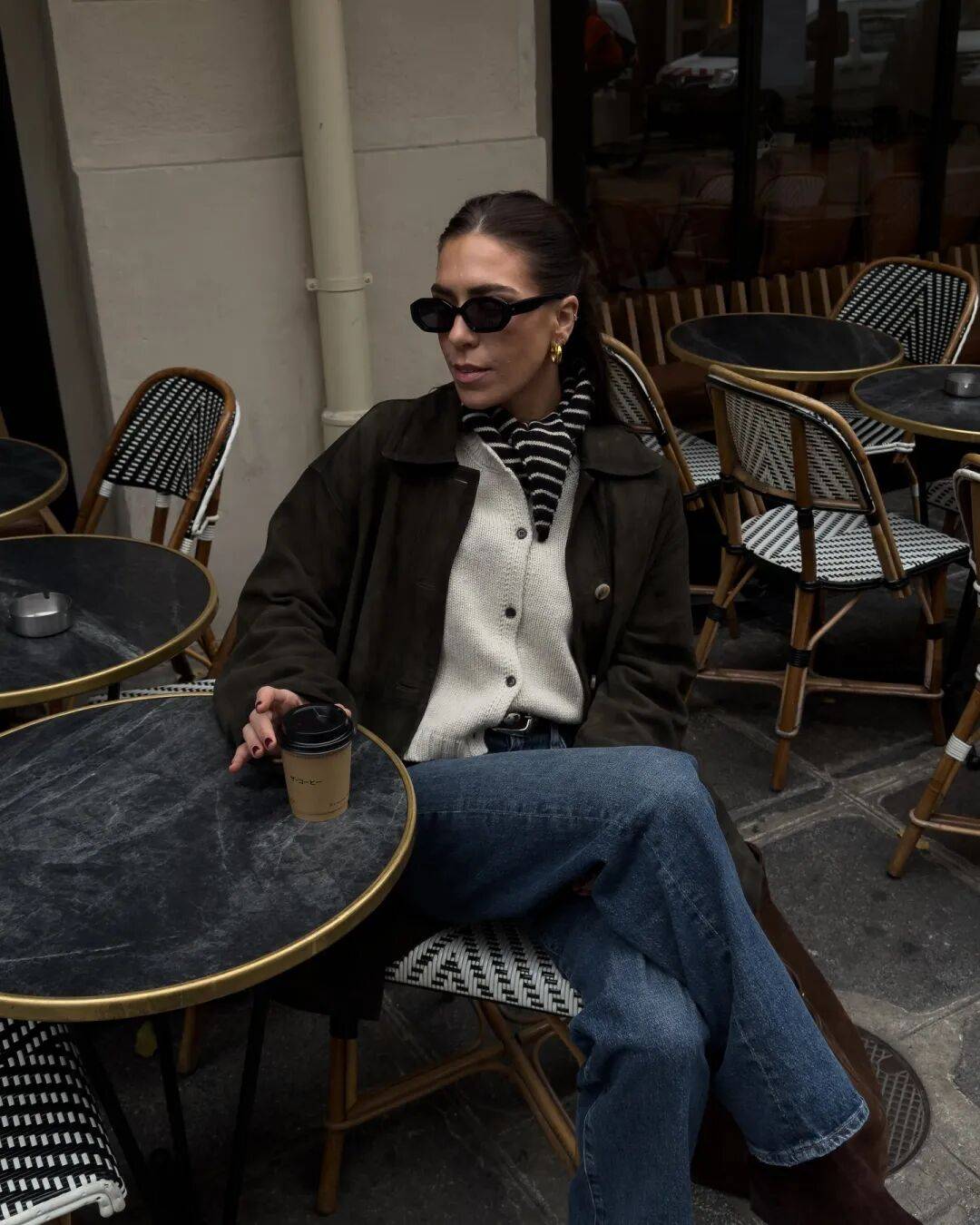 Hayley這身特別適合抄作業,一身牛仔+麂皮棕色外套+綠色三角巾,配色很好看,保暖度在秋天管夠。