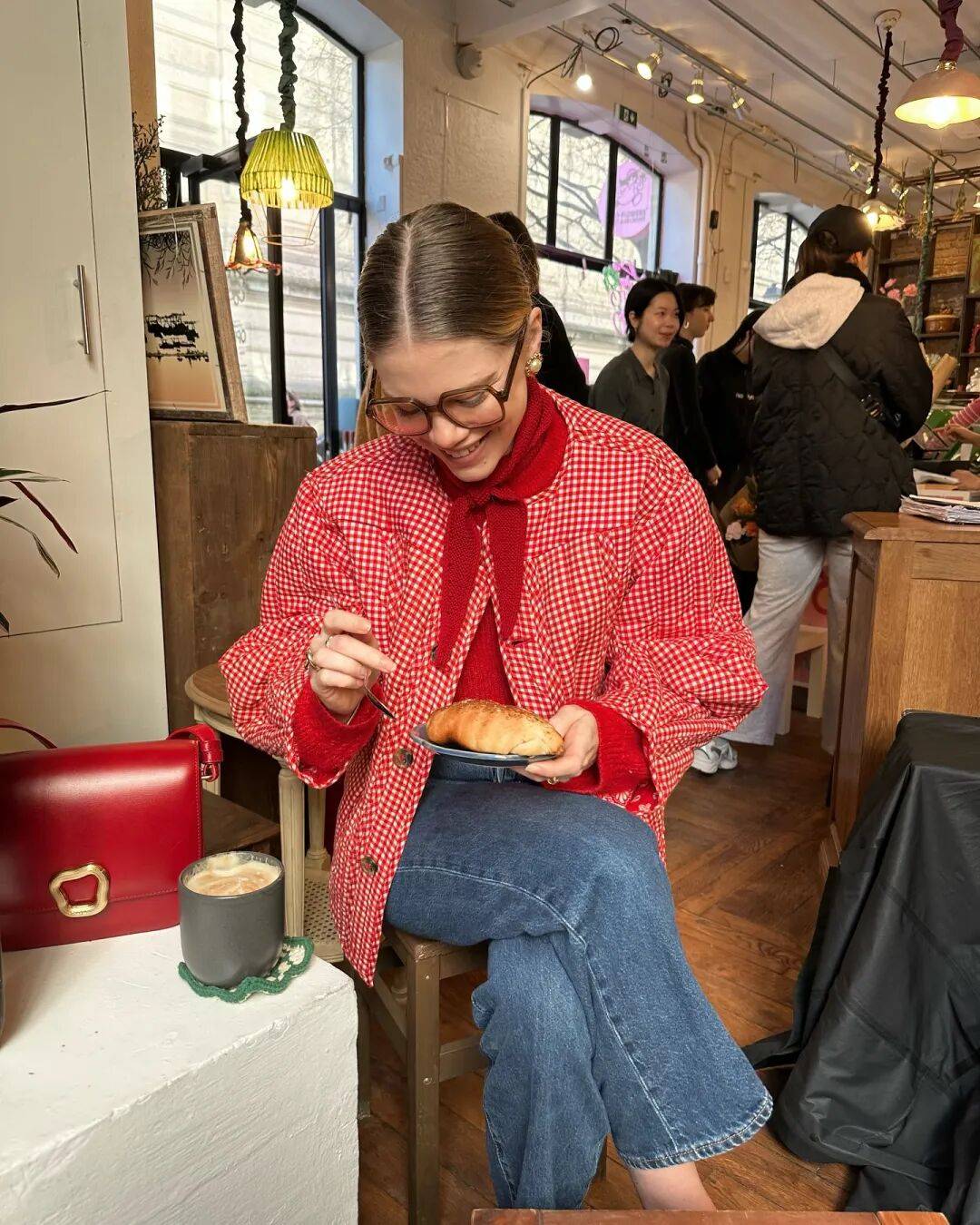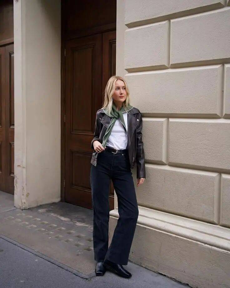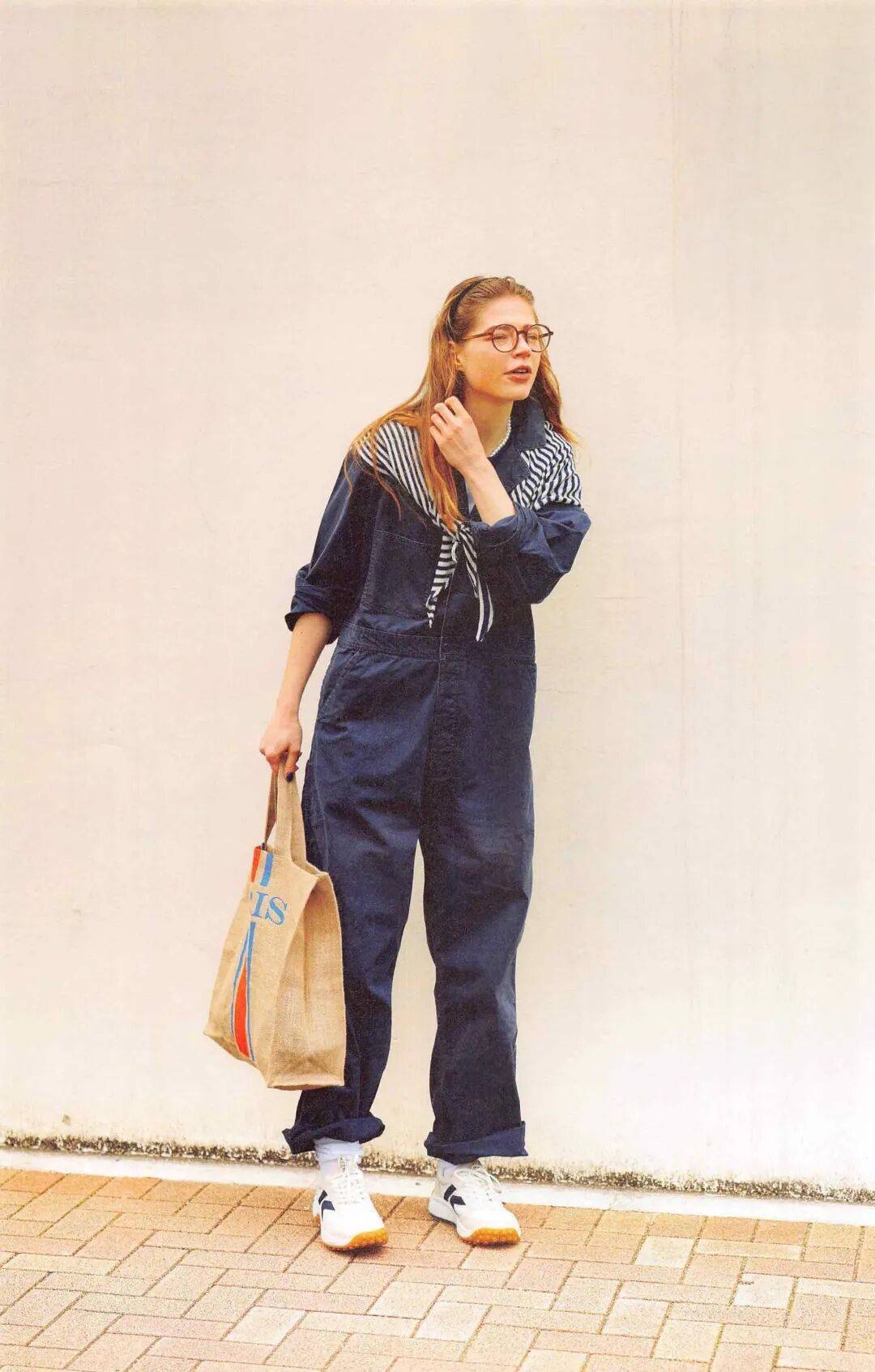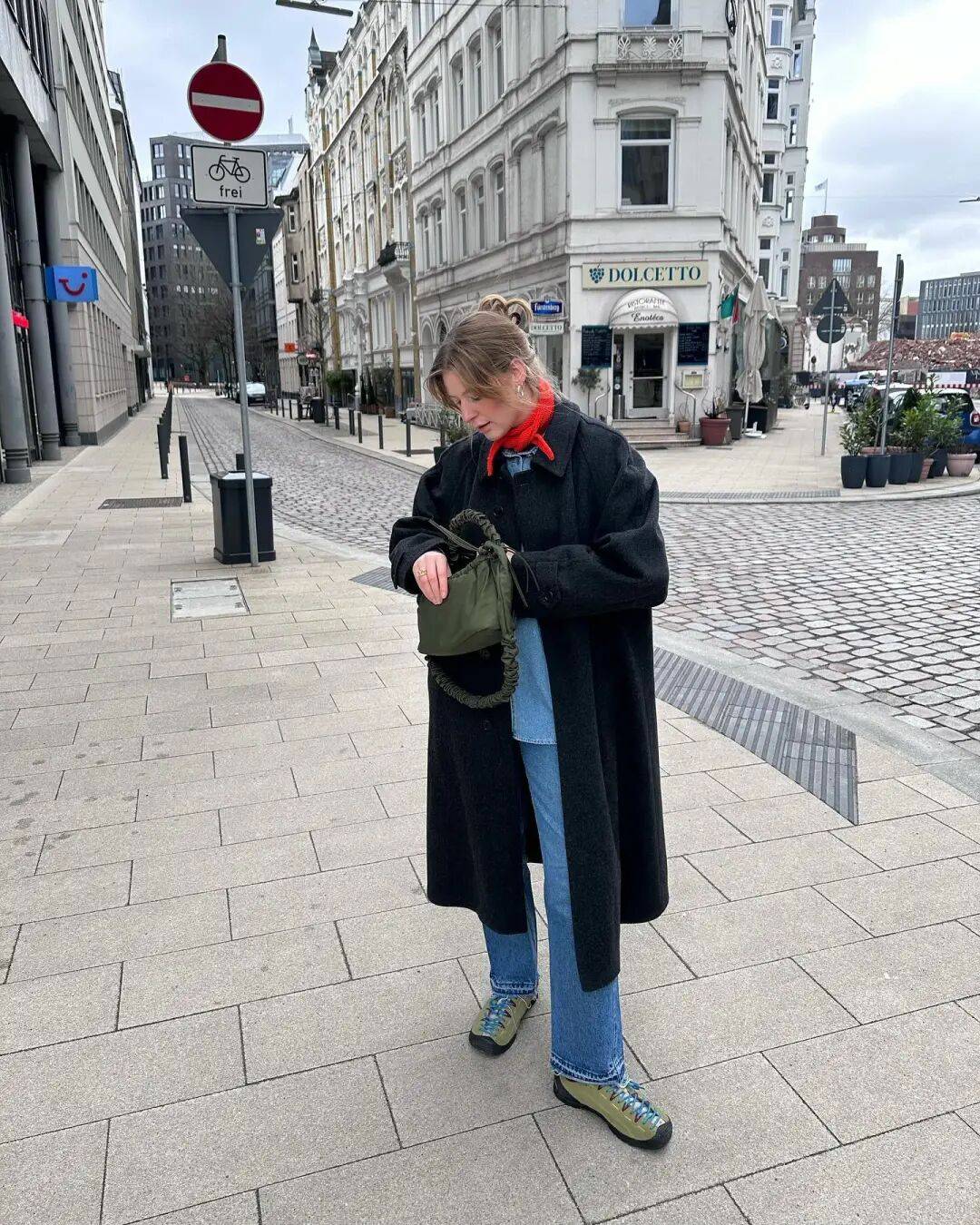 德國博主Emely這身配色挺妙的,主色調是黑色+牛仔藍,加入20%的綠色和10%的紅色,足以打破大麵積黑色的沉悶感。▼
