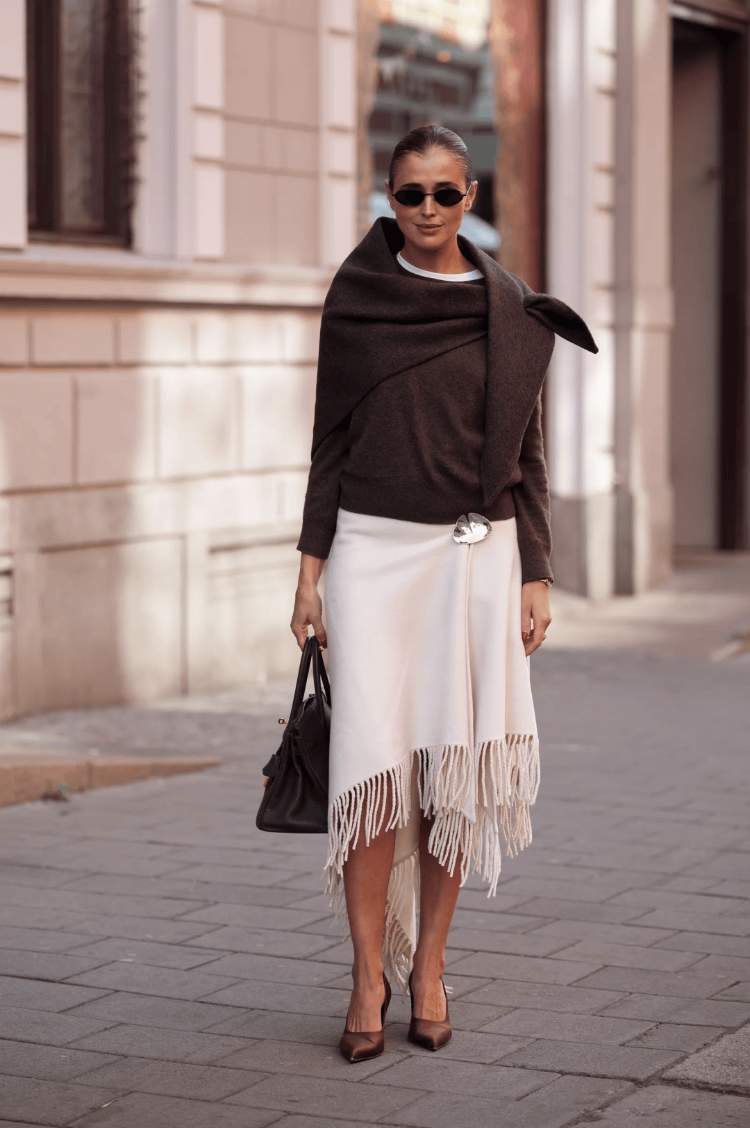 還可以歪著披,更有個性。有沒有發現下麵這身造型裏,是用圍巾做成了半裙,真是藝高人膽大哈哈。▼
