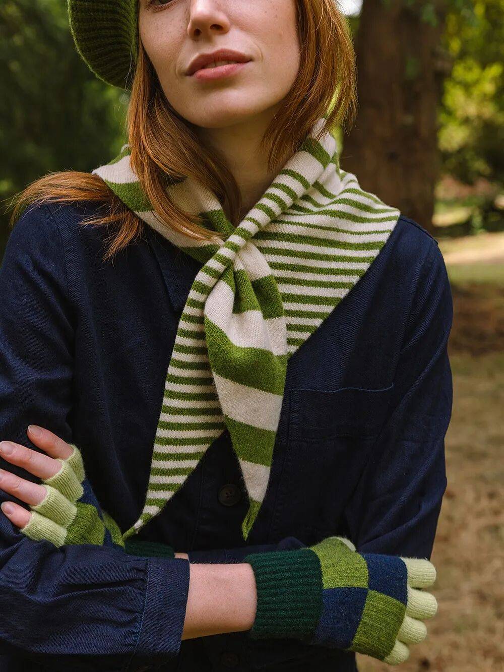 除了純色圍巾,也可以選擇彩色條紋圍巾,在穿搭裏同樣是玩撞色的一把好手,很多品牌都有出。
