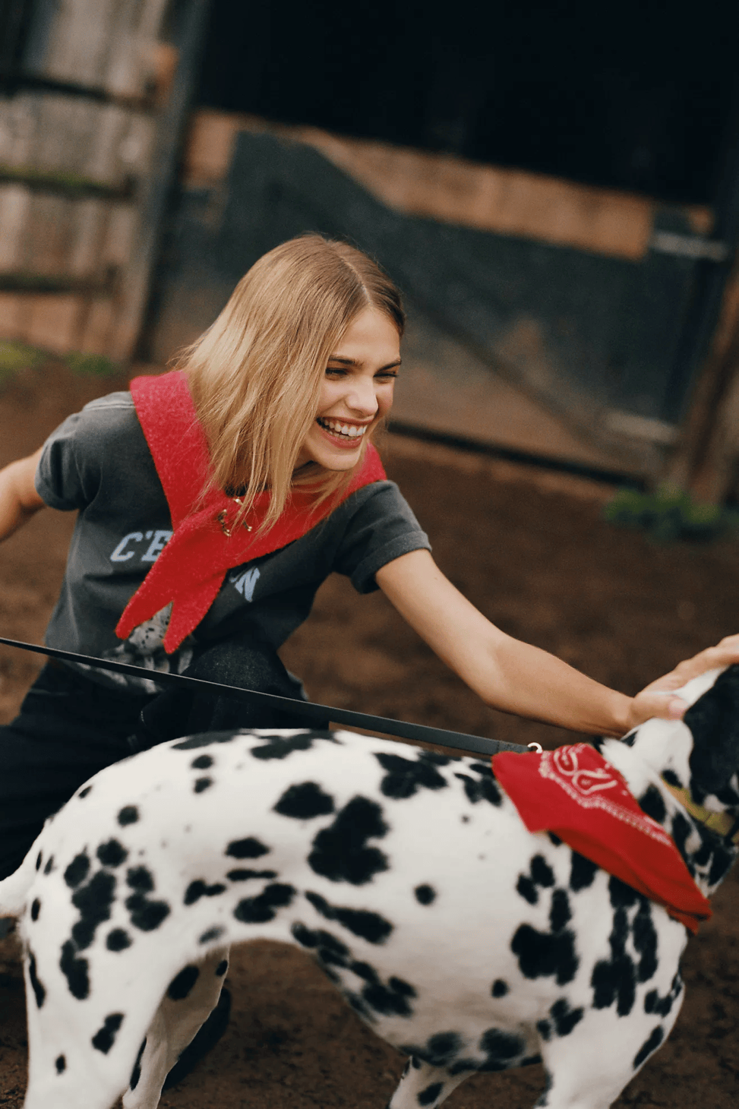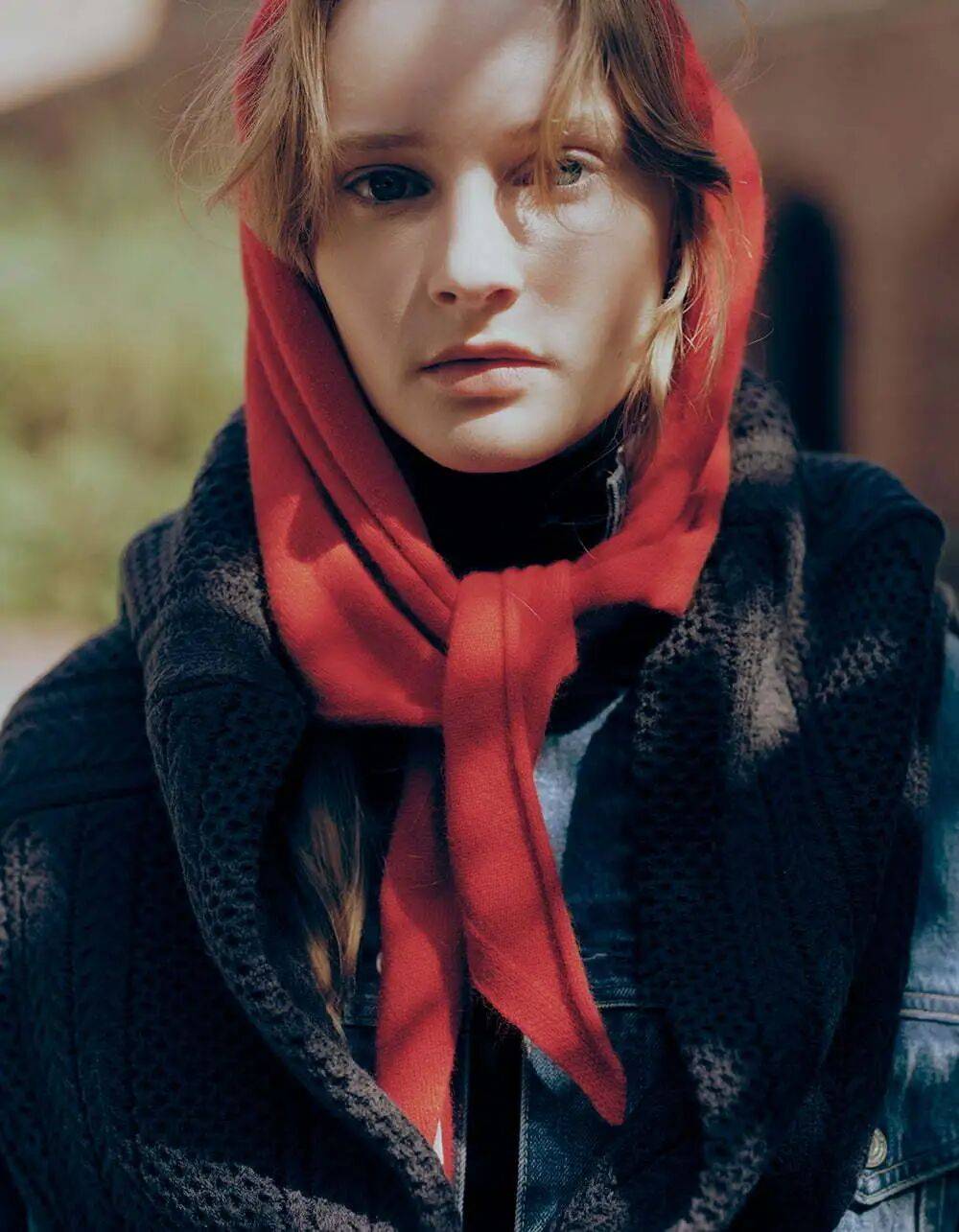 很多品牌拍lookbook都會首選紅色三角巾來點綴,原因無他,真的很出片。這張是Anthropologie的海報,他家這條三角巾,紅色裏麵混紡了白色紗線,有點花紗的感覺,官網參考價約312元。▼