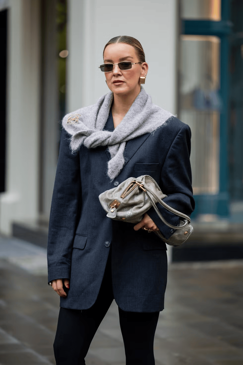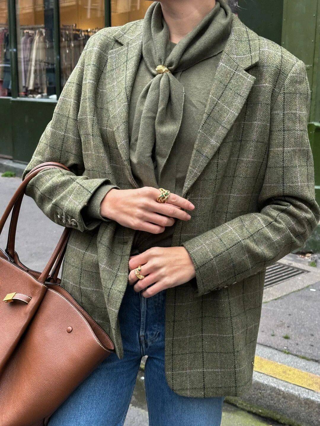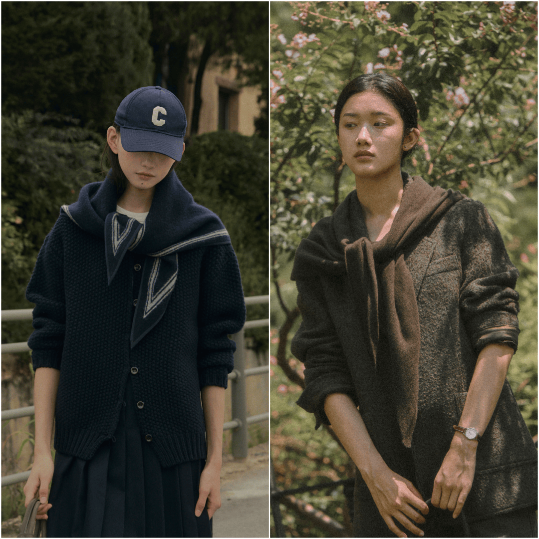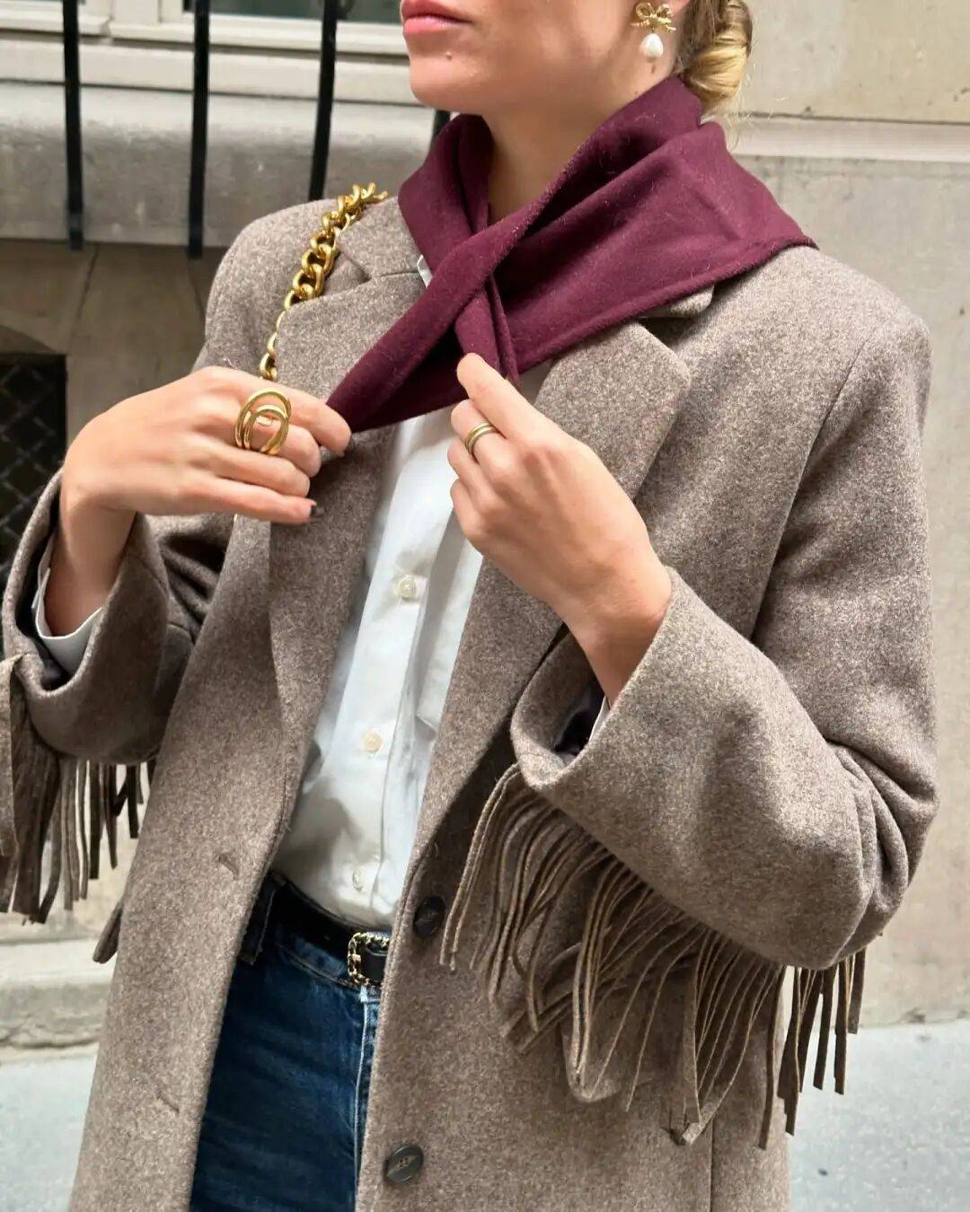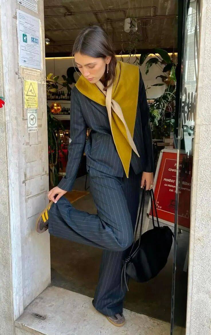同色會更有套裝感,現在也有不少品牌帶有三角巾設計的上衣/外套,不過點綴效果就會削弱很多啦。▼