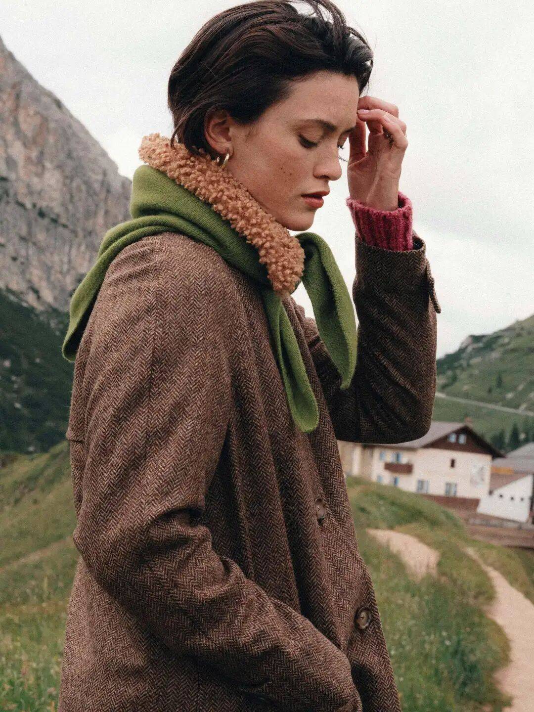 綠色三角巾配棕色外套,就像是大地上剛破土而出的新芽,這個搭配可以一直穿到開春。▼